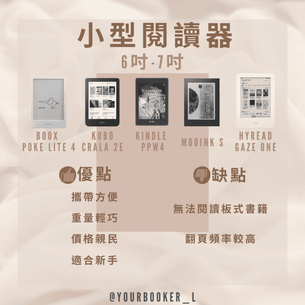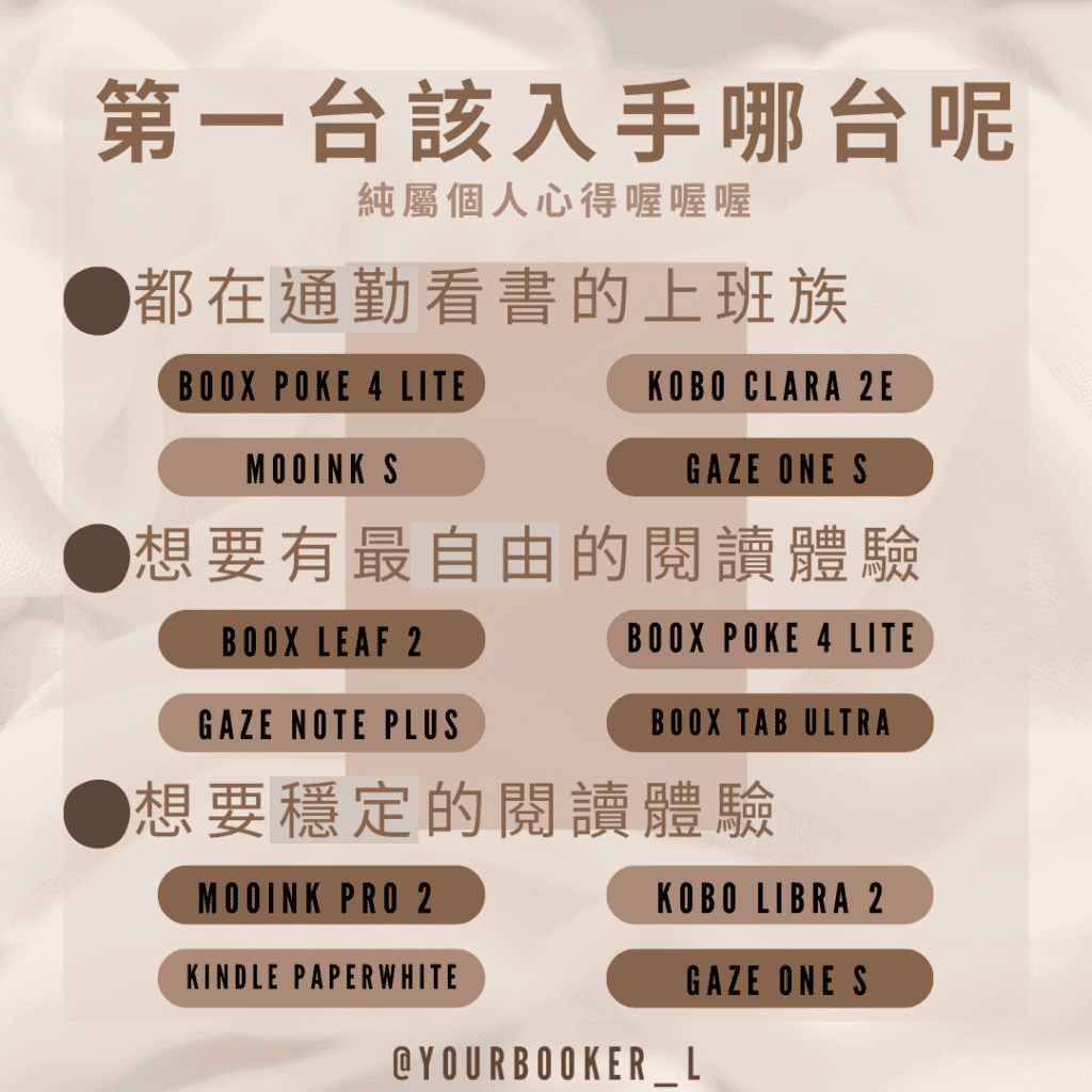 像是kobo clara 2E、kindle paperwhite、mooinkS等其實都是很好的入門款,但大小部分還是要依照個人需求和預算而定。