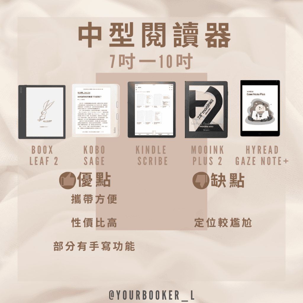 中型閱讀器的區間從7吋、7.8吋到10吋以內,大小約為A5紙張。