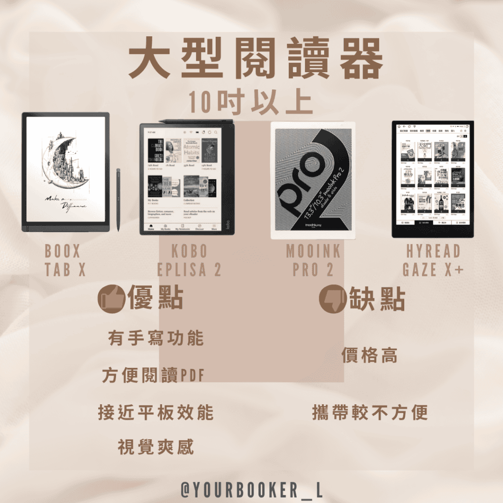 10吋以上的閱讀器基本上就是一台平板的大小了,因此比較適合定點閱讀的使用。