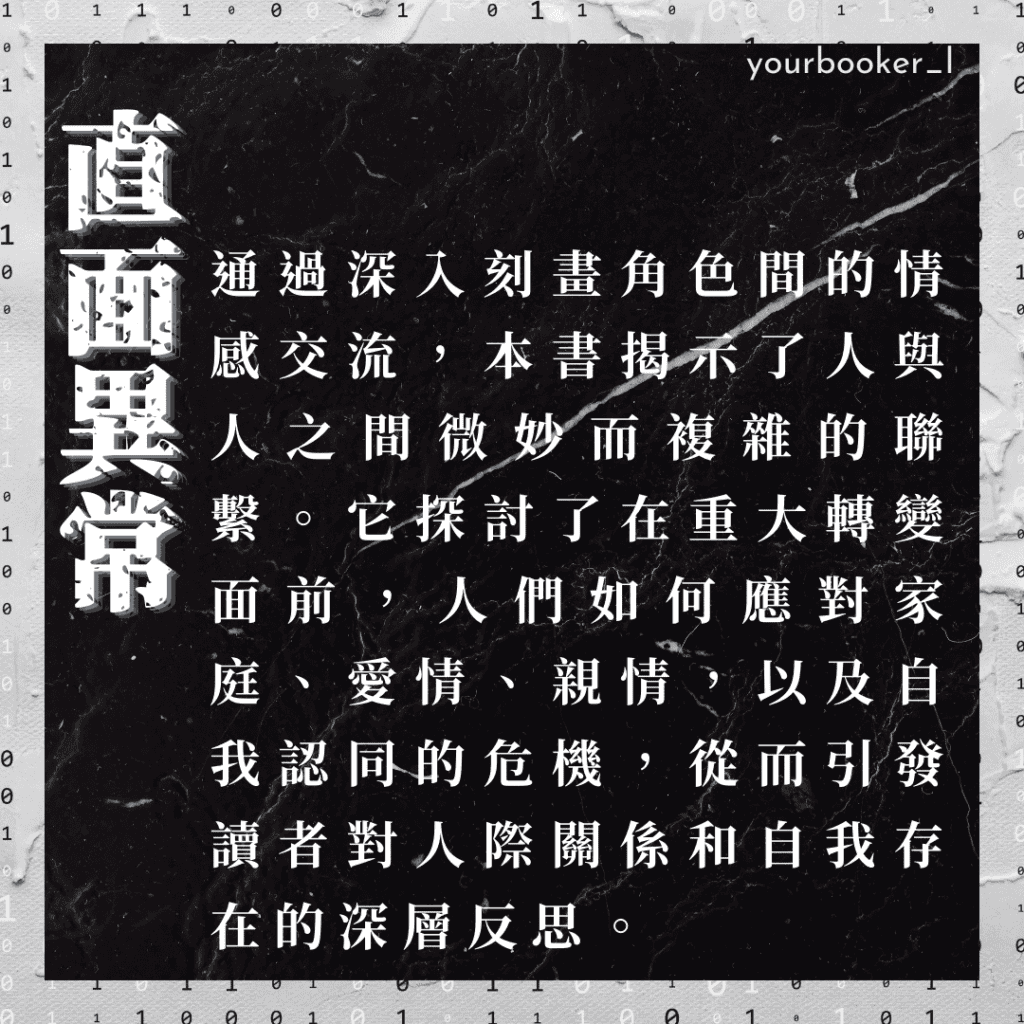 而這本《異常》,便是嘗試透過其獨特的文學手法,邀請讀者對科幻背後人性意涵,一起進行一場腦力激盪。